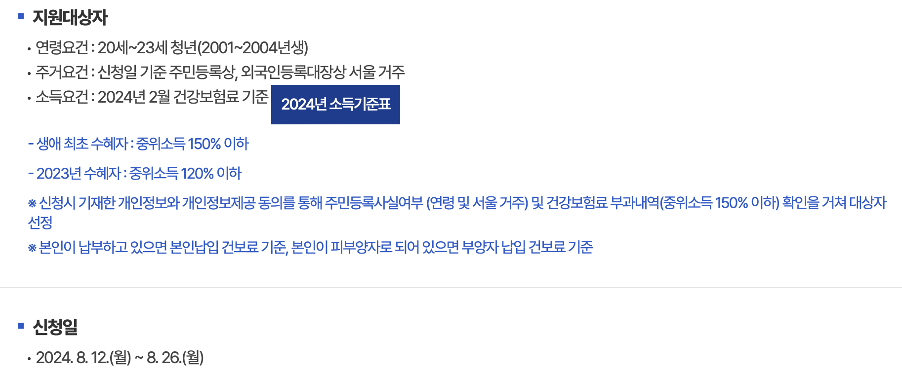 - 신청 자격: 신청일 기준 서울시에 주민등록상 거주 중이어야 하며, 소득 기준을 충족해야 합니다
