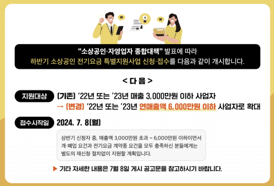 3. 지원 금액 상향 : 전기요금 지원 금액이 기존보다 상향 조정되어 소상공인의 부담을 더욱 덜어줍니다.